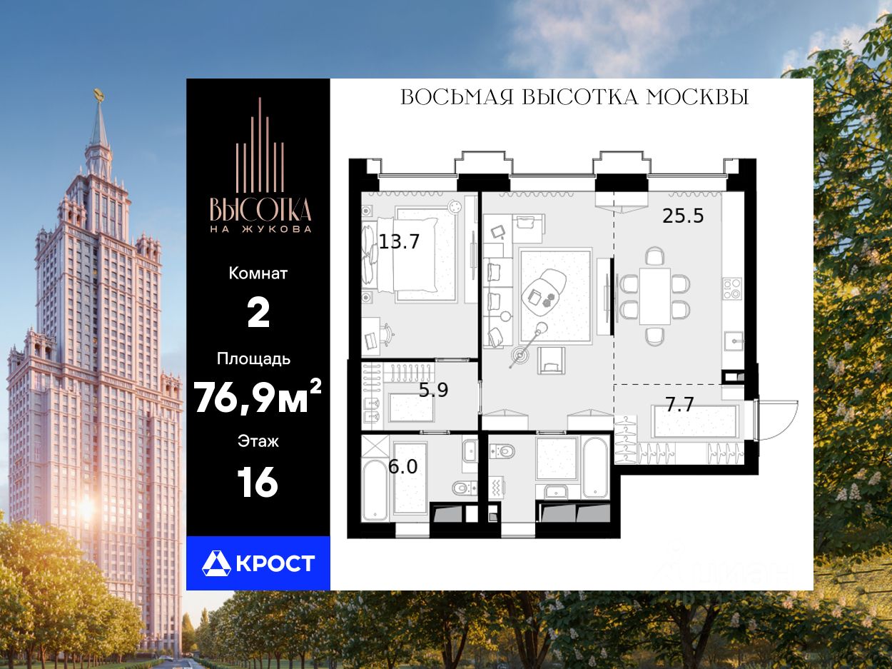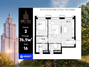 Двухкомнатная квартира площадью 76,90 кв. м. на 16 этаже нового дома премиум-класса Высотка на Жукова