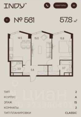 Площадь комнат - 15,0 и 15,8 м.кв.
