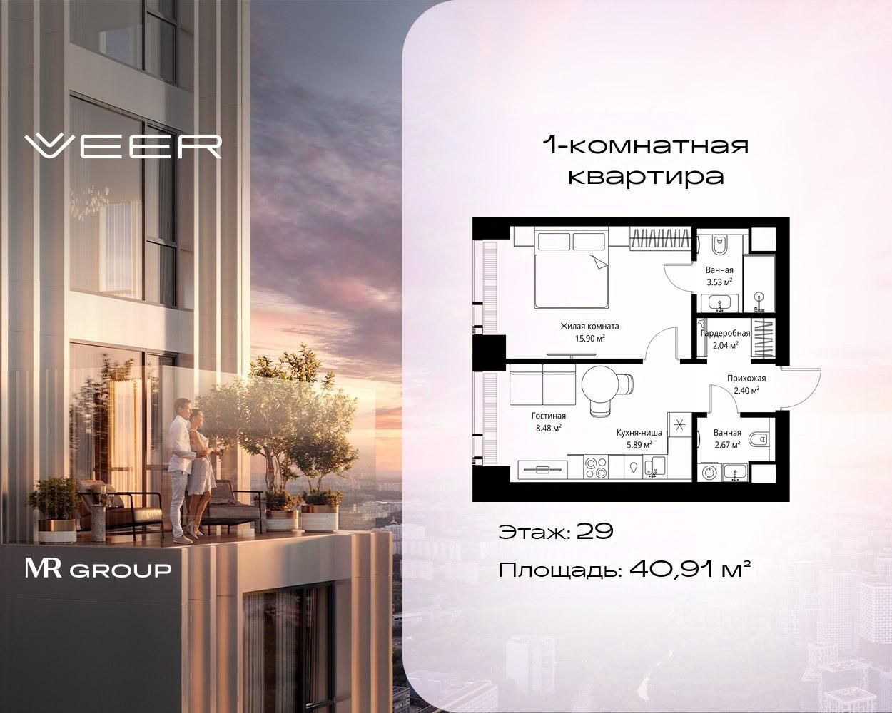 Продаётся 1-комнатная квартира общей площадью 40.91 м² без отделки в ЖК VEER на 29-м этаже 70 этажного дома.