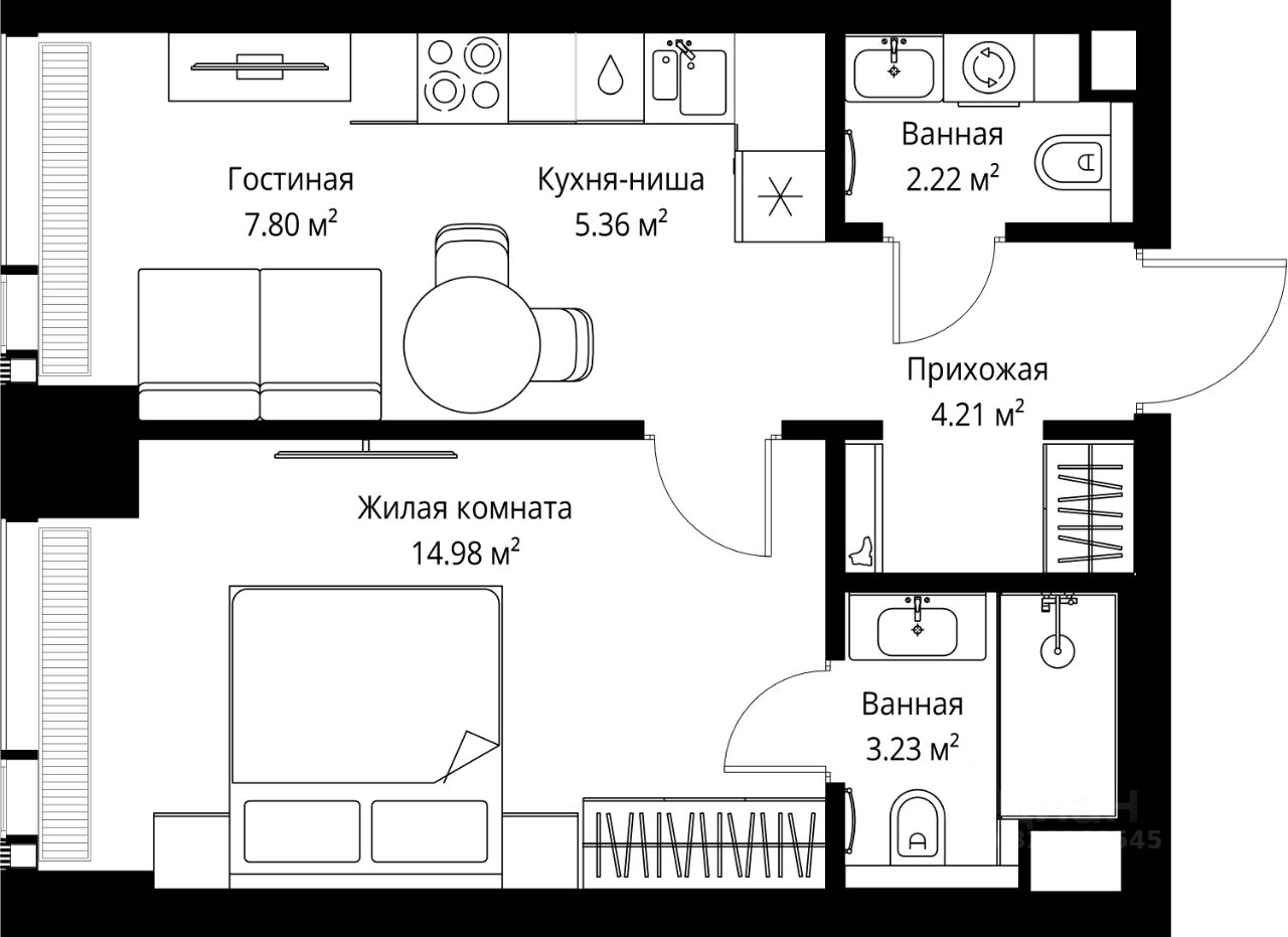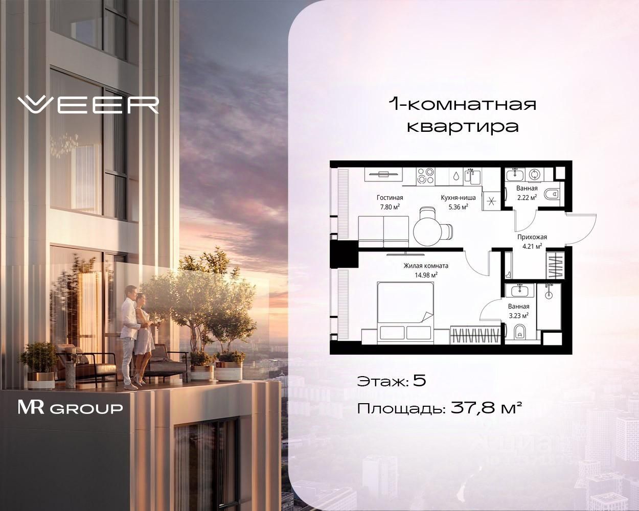 Продаётся 1-комнатная квартира общей площадью 37.80 м² без отделки в ЖК VEER на 5-м этаже 70 этажного дома.