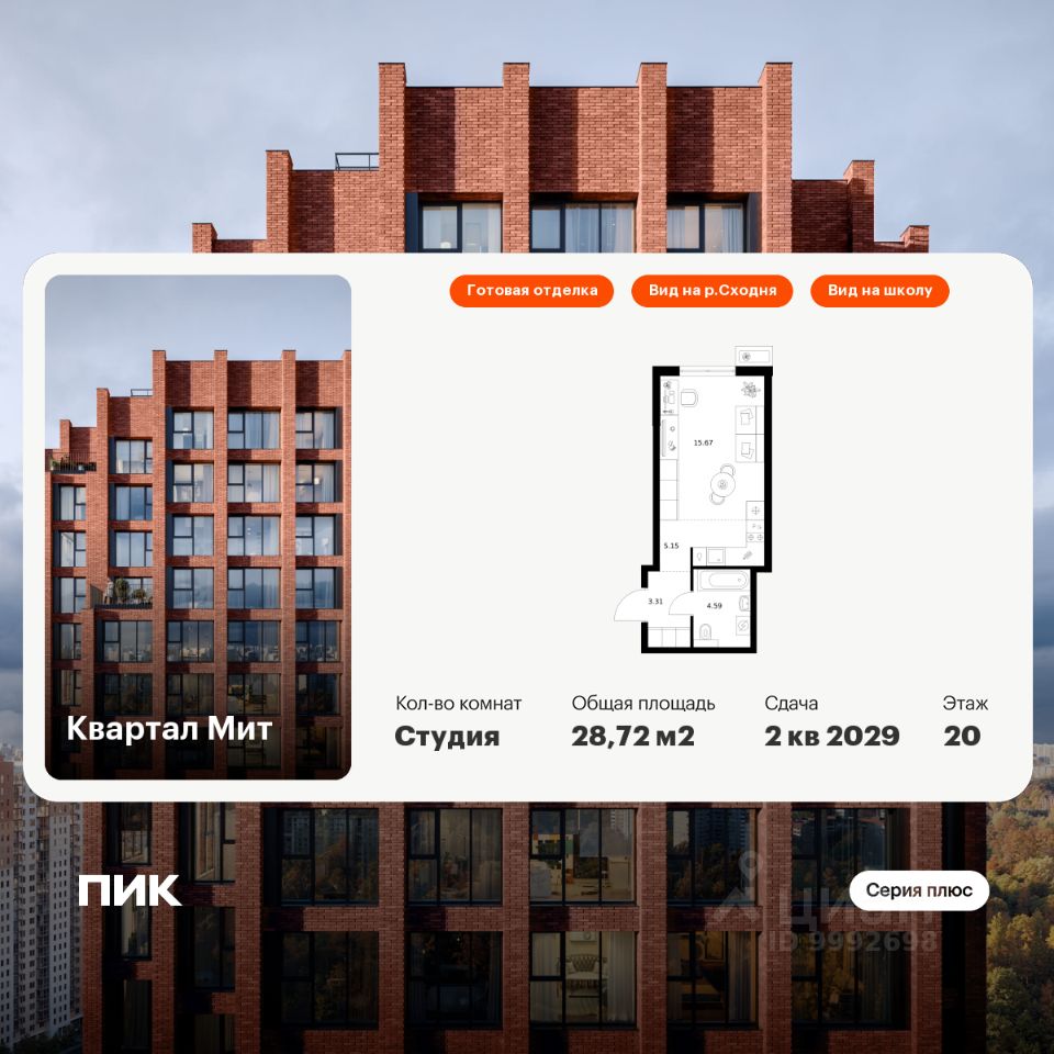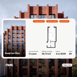 Новостройка! Продается 1-комн. кв-ра площадью 28,72 кв.м, (Корпус 3.4, Секция 4) 20 этаж 32-этажного дома в Квартал Мит от ПИК. "Квартал Мит" строится в экологически чистом районе Митино, где по соседству расположен большой лесопарк, а с двух сторон протекают реки Сходня и Журавка. Для семей с детьми здесь появится школа и два детских сада.
