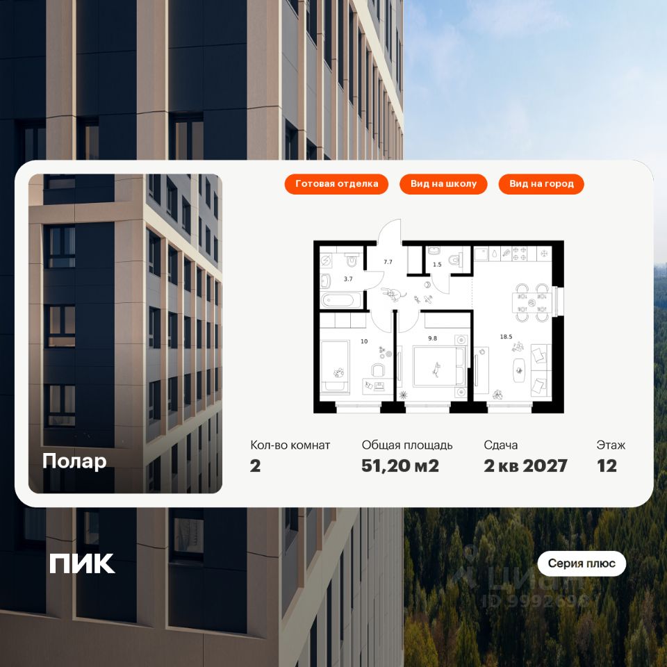 Продаётся 2-комн. квартира площадью 51,2 кв.м на 12 этаже 14 этажного дома (Корпус 1.6, Секция 3) проекта ПИК Полар. Светлый просторный подъезд на уровне земли, функциональная планировка, большие окна, c отделкой.