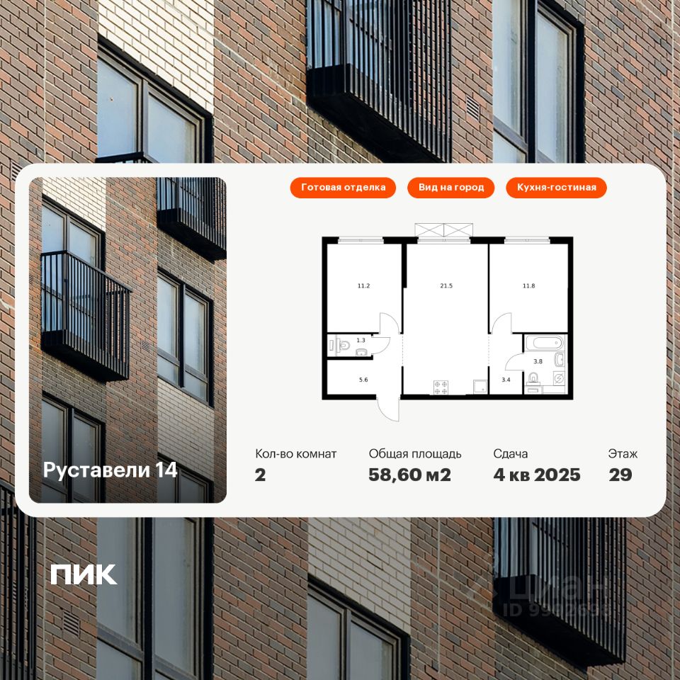 Продаётся 2-комн. квартира площадью 58,6 кв.м на 29 этаже 33 этажного дома (Корпус 2.5, Секция 1) проекта ПИК Руставели 14. Светлый просторный подъезд на уровне земли, функциональная планировка, большие окна, c отделкой.