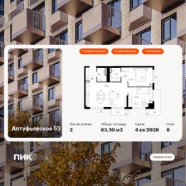 Продаётся 2-комн. квартира площадью 63,1 кв.м на 6 этаже 22 этажного дома (Корпус 1.1, Секция 1) проекта ПИК Алтуфьевское 53. Светлый просторный подъезд на уровне земли, функциональная планировка, большие окна, c отделкой.