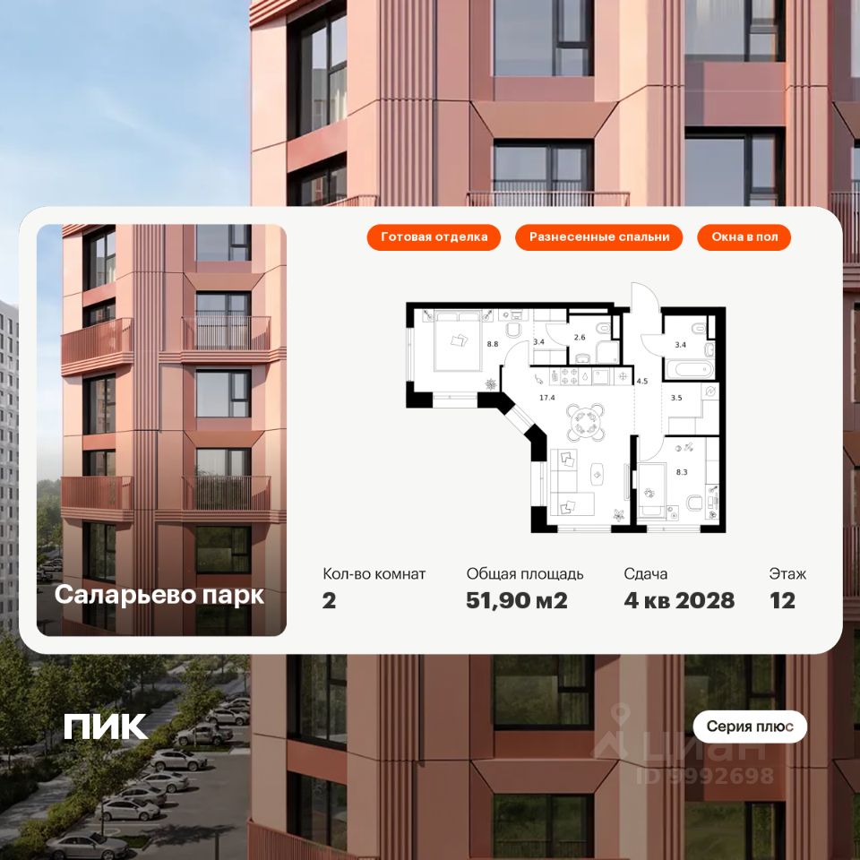 Продаётся 2-комн. квартира площадью 51,9 кв.м на 12 этаже 16 этажного дома (Корпус 82.2, Секция 2) проекта ПИК Саларьево парк. Светлый просторный подъезд на уровне земли, функциональная планировка, большие окна, c отделкой.