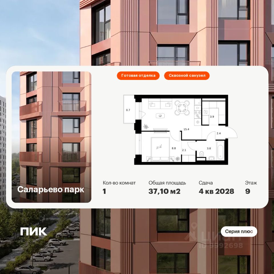 Продаётся 1-комн. квартира площадью 37,1 кв.м на 9 этаже 24 этажного дома (Корпус 82.8, Секция 8) проекта ПИК Саларьево парк. Светлый просторный подъезд на уровне земли, функциональная планировка, большие окна, c отделкой.