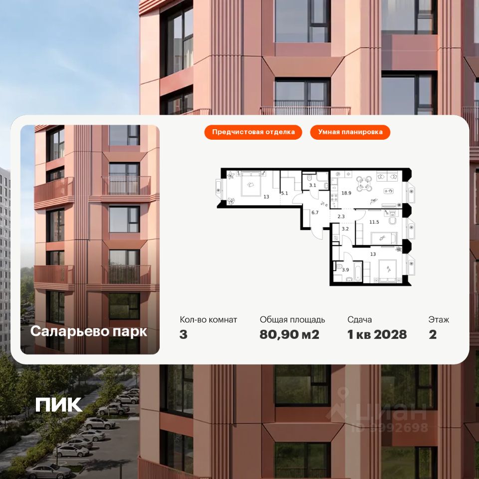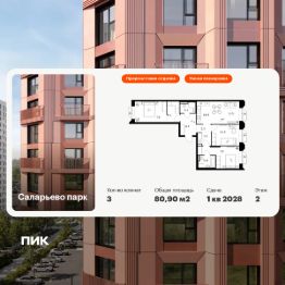 Продаётся 3-комн. квартира площадью 80,9 кв.м на 2 этаже 14 этажного дома (Корпус 74.3, Секция 3) проекта ПИК Саларьево парк. Светлый просторный подъезд на уровне земли, функциональная планировка, большие окна, предчистовая отделка.
