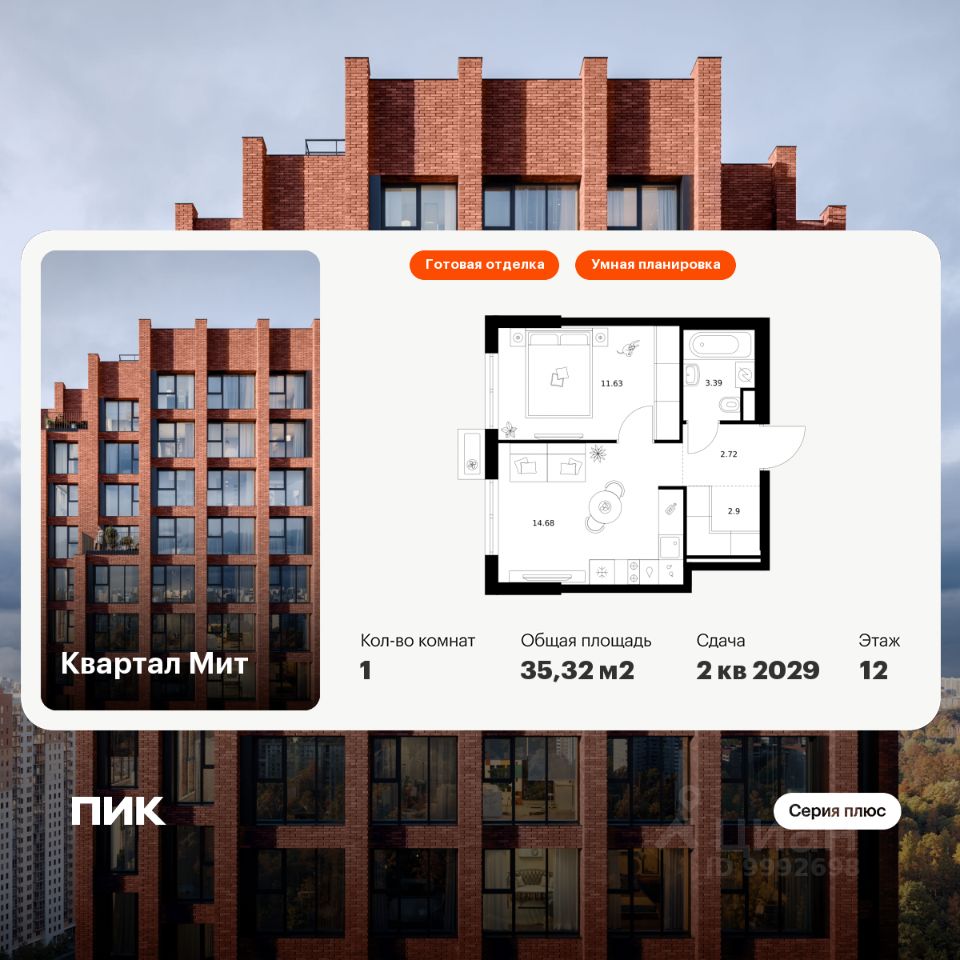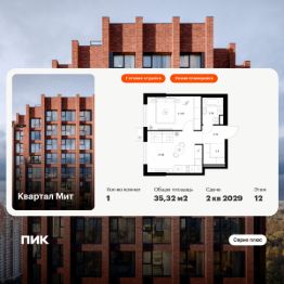 Новостройка! Продается 1-комн. кв-ра площадью 35,32 кв.м, (Корпус 3.4, Секция 4) 12 этаж 32-этажного дома в Квартал Мит от ПИК. "Квартал Мит" строится в экологически чистом районе Митино, где по соседству расположен большой лесопарк, а с двух сторон протекают реки Сходня и Журавка. Для семей с детьми здесь появится школа и два детских сада.