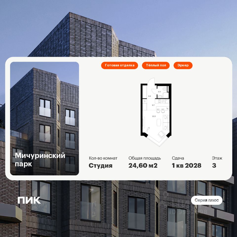 Продаётся квартира-студия площадью 24,6 кв.м на 3 этаже 31 этажного дома (Корпус 4.3, Секция 2) проекта ПИК Мичуринский парк. Светлый просторный подъезд на уровне земли, функциональная планировка, большие окна, c отделкой.