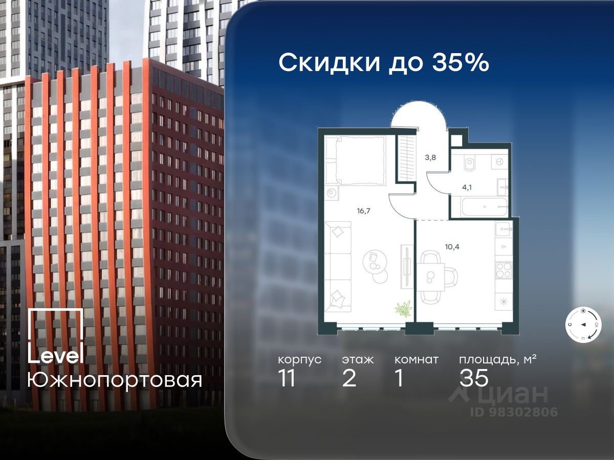 В северной части района Печатники продается 1-комнатная квартира площадью 35.00 кв.м без отделки. Квартира расположена на 2 этаже 16-этажного корпуса 11 в жилом комплексе комфорт-класса Level Южнопортовая (компания Level Group/Левел групп).