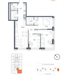 Просторную трёхкомнатную квартиру площадью 85,3 м² на 24м этаже 1го корпуса.