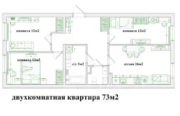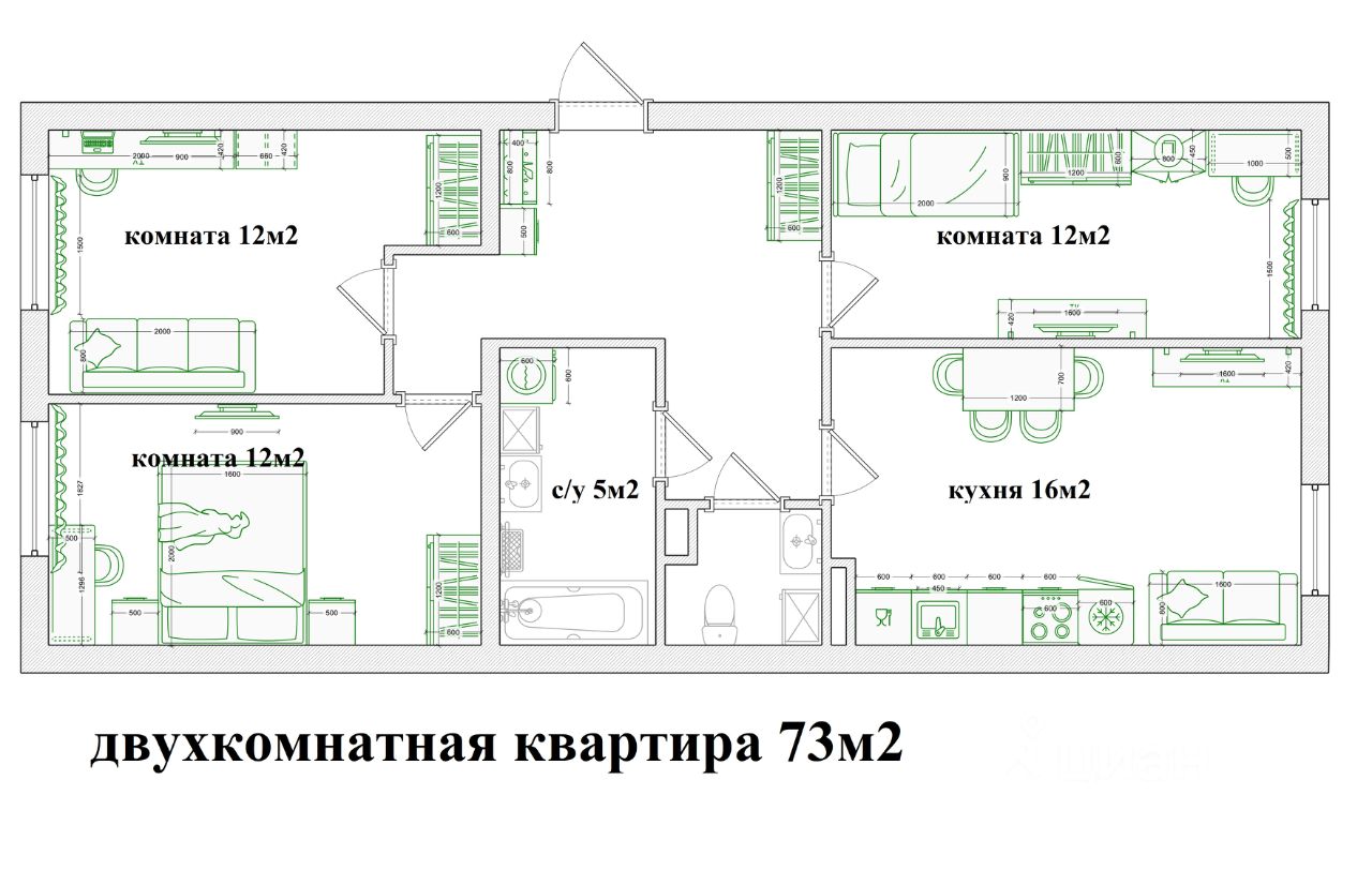 Три изолированные комнаты по 12м2 и просторная кухня 16м2, два с/у.