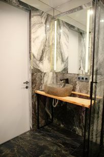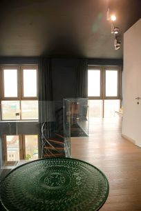 Элегантная круговая лестница ведет на второй этаж, где расположена спальня, практичная гардеробная и современная душевая.