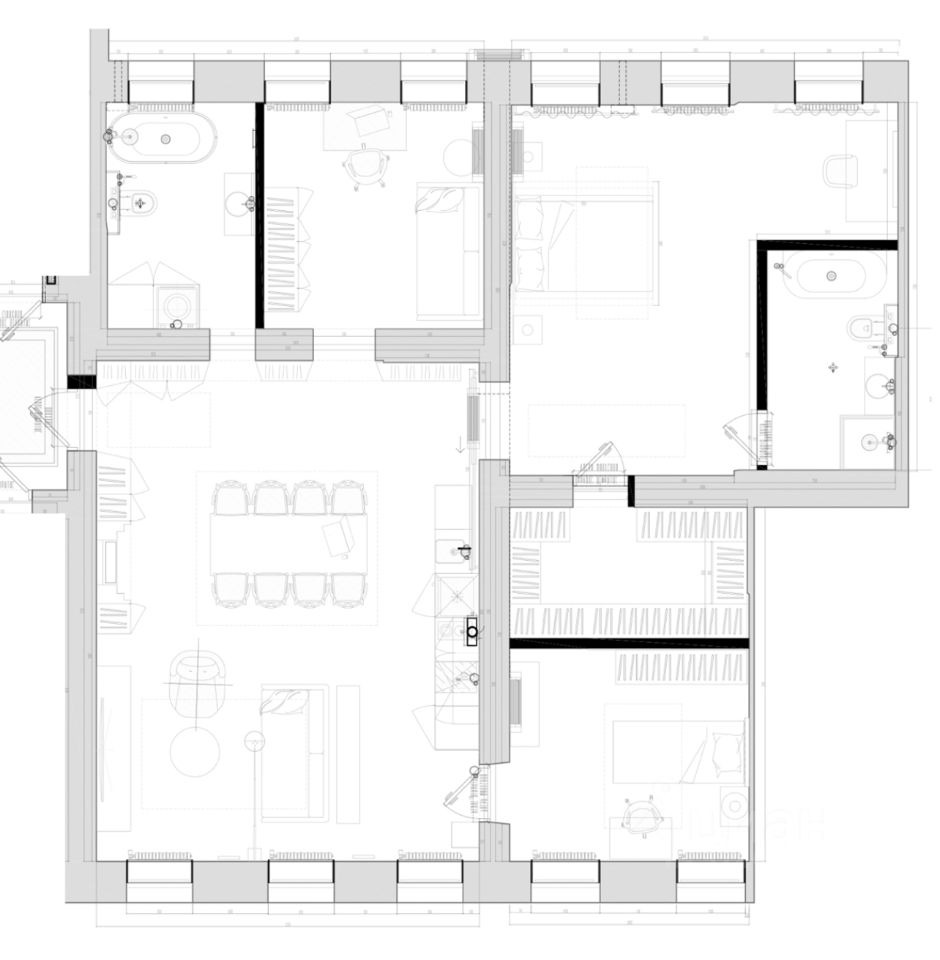 Квартира тихая и светлая, общая площадь 105 кв.м., из них кухня-гостиная 39.7кв.м., мастер-спальня 30кв.м, со своим санузлом и гардеробной, две комнаты 11 кв.м. и 17 кв.м., плюс второй санузел 7.2кв.м. с окном во двор. Расположена квартира на третьем этаже, лифта нет. Есть дымоход, возможно установить камин в гостинной.