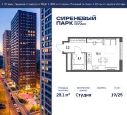 Продаётся просторная студия общей площадью 28.1 м² на 19 этаже в новом жилом комплексе "Сиреневый парк", расположенном в Восточном административном округе Москвы на улице Тагильская. Всего 10 минут ходьбы от станции метро "Бульвар Рокоссовского" и одноимённой платформы МЦК.