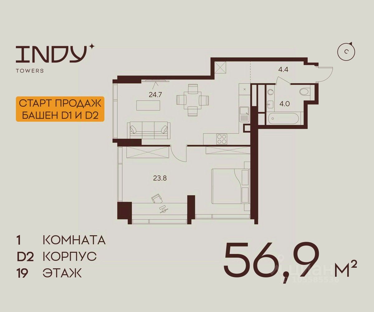 Продается уютная однокомнатная квартира на 19 этаже жилого комплекса Indy Towers. Срок сдачи: 3 кв. 2029 г.