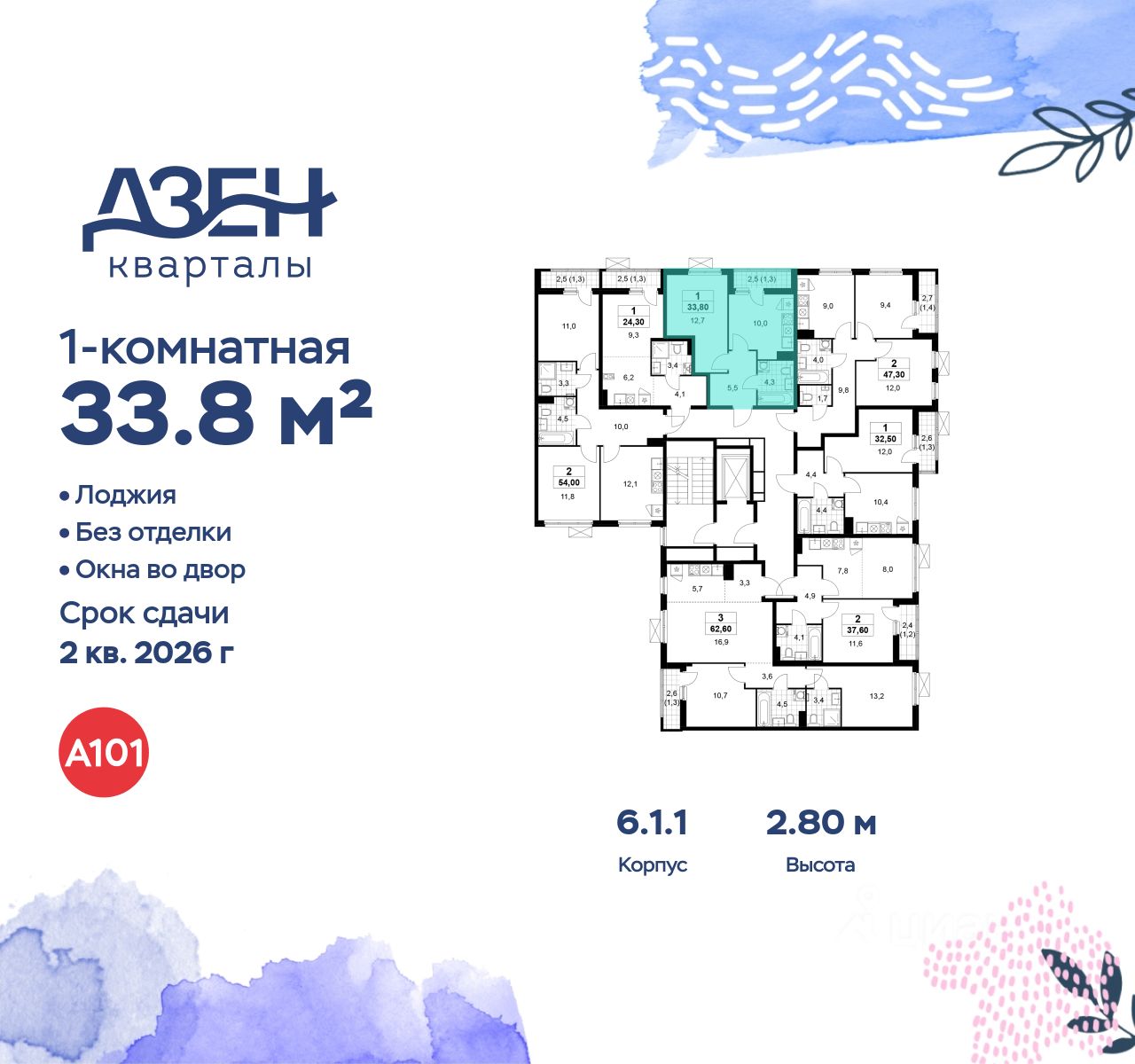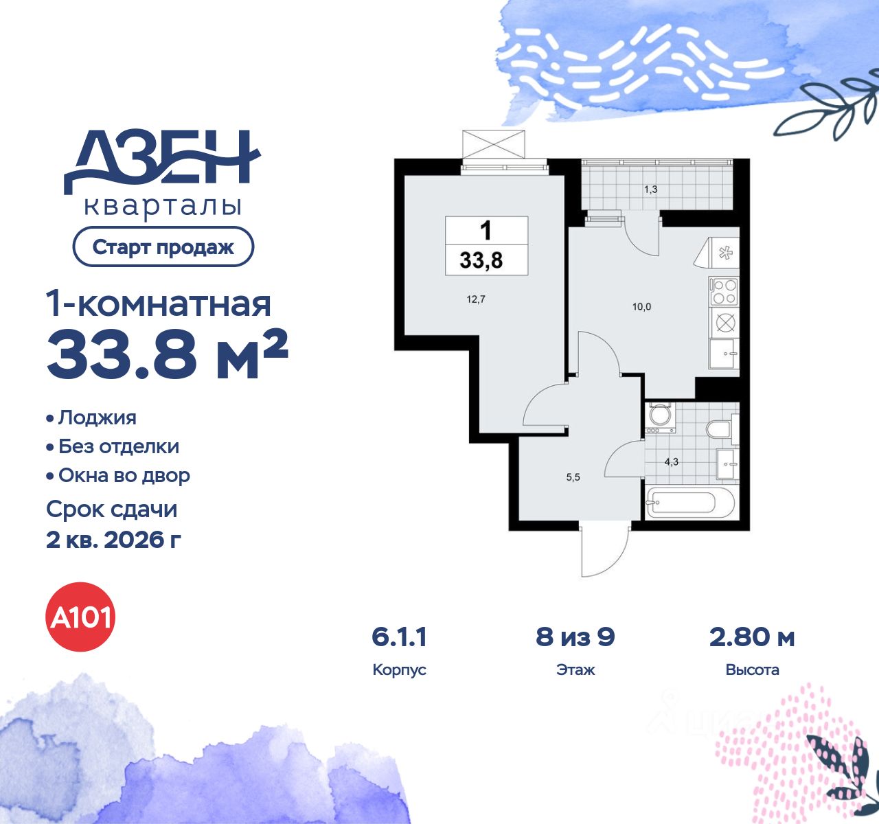 Продается однокомнатная квартира 125 в новостройке ЖК "Дзен-кварталы" по адресу Москва, ТиНАО, Новомосковский АО, Сосенское С/П, жилой комплекс Дзен-кварталы, 6.1.1, район Коммунарка, Новомосковский административный округ, Москва. Общая площадь квартиры - 33.80 кв. м., этаж 8 из 9, секция 3. Тип проекта, по которому построен дом - монолит, компания-застройщик - ООО "А101". Стоимость квартиры - 13426374 Р. Срок сдачи - 2 квартал 2026.