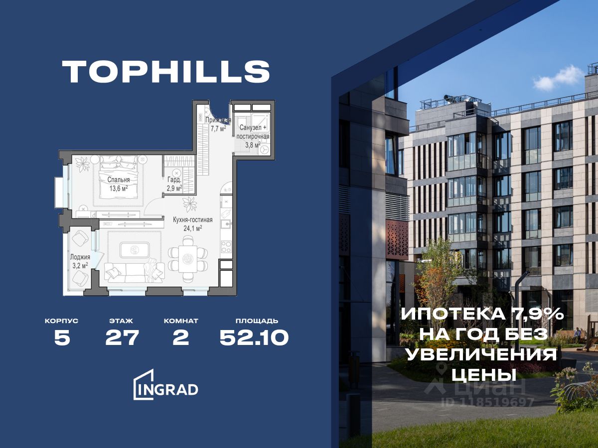 Прямая продажа от застройщика. В жилом квартале, расположенном в Нагорном районе Москвы, продаётся 2-спальная квартира площадью 52.10 кв.м без отделки. Квартира расположена на 27 этаже 27-этажного дома, корпус 4, в жилом квартале бизнес-класса TopHILLS (застройщик ГК Инград).