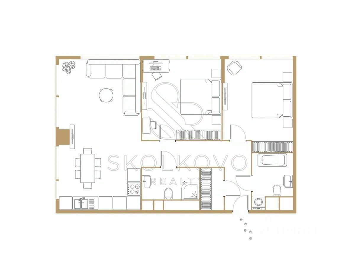 Планировка: кухня, объединенная с гостиной, 2 спальные комнаты, 2 полноценных санузла.