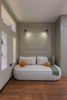 • Зонирование: Дизайнерская перегородка формирует приватную спальню, сохраняя ощущение света и простора.