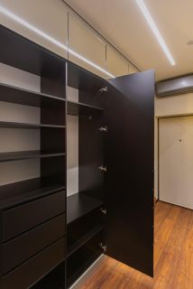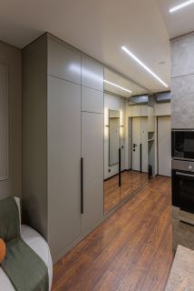 • Мебель: Вся мебель выполнена на заказ под геометрию квартиры, включая кровать с подъемным механизмом.