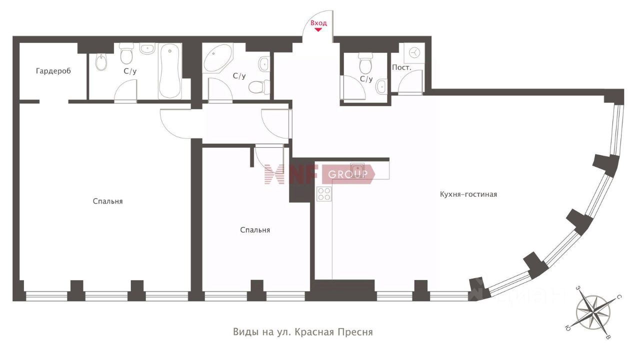 Оптимальный вариант организации пространства: гостиная с зоной кухни, мастер-спальня с ванной и гардеробной, спальня с ванной комнатой, гостевой санузел.