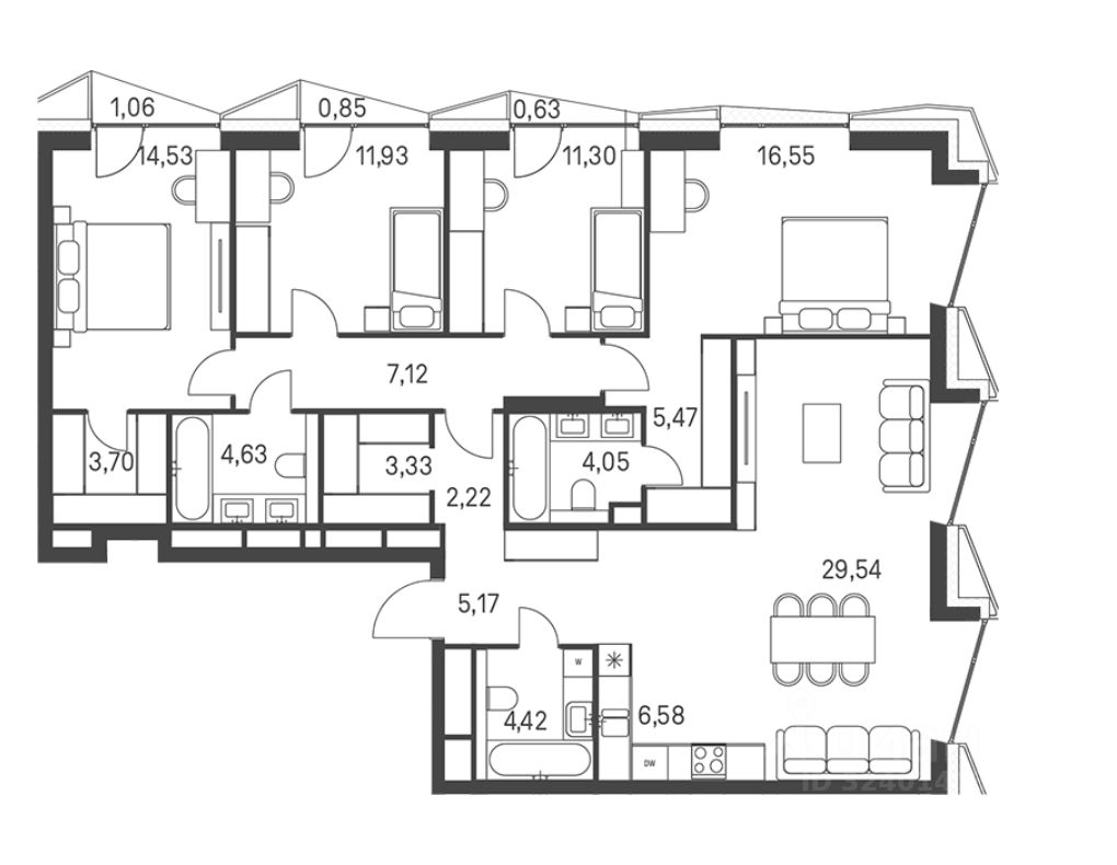 Планировка: 37м2 кухня-гостиная, 2 мастер блока с ванной и гардеробной, 2 детские спальни.