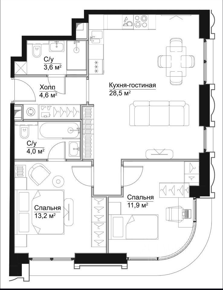 Функциональная планировка: две изолированные спальни, просторная кухня-гостиная, два санузла