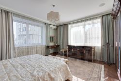 В квартире расположены две большие спальни, включая мастер-спальню с собственным санузлом и полноценной гардеробной комнатой. Отдельный кабинет позволяет организовать рабочее пространство или тихую зону для занятий, или использовать ее, как третью спальню.