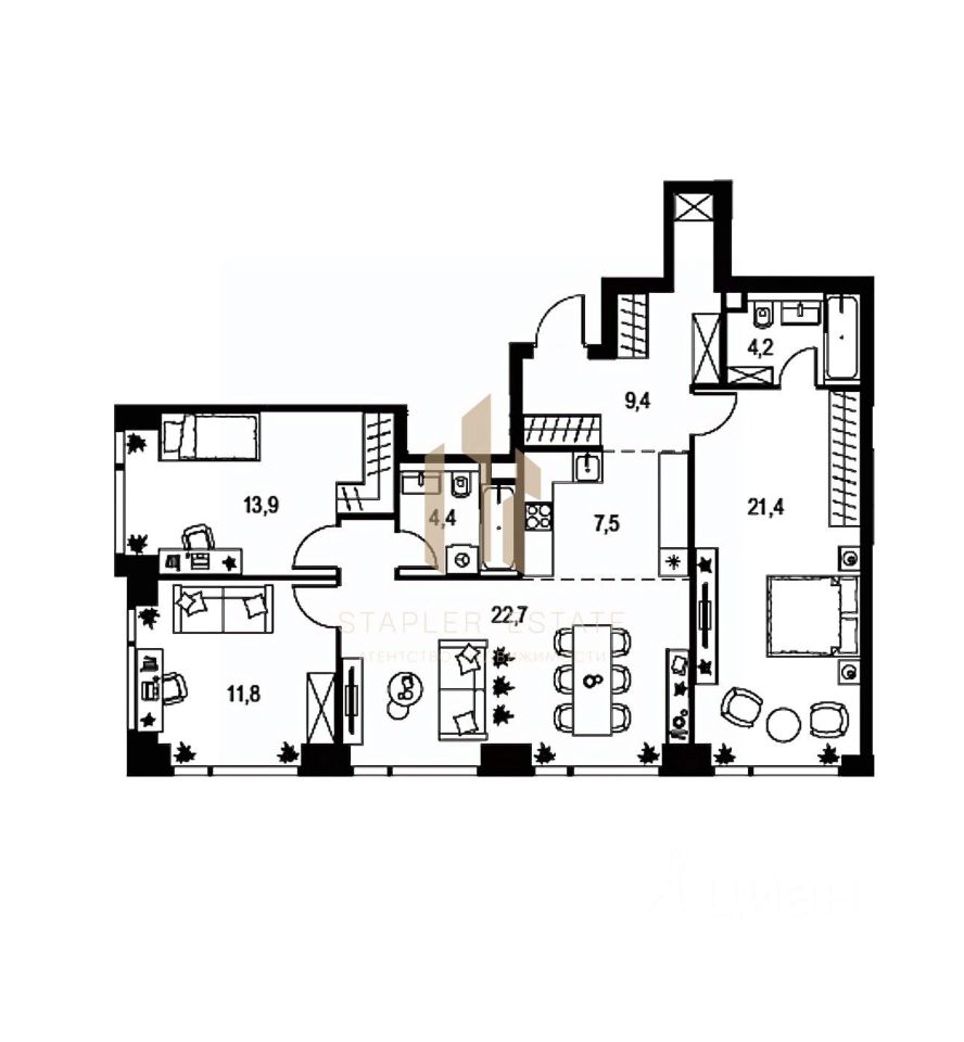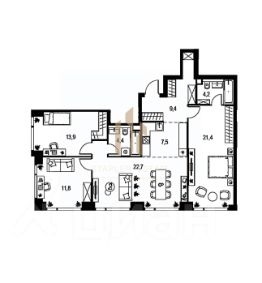 - Планировка предполагает: просторную кухню, гостиную, две спальни, два санузла (возможно спланировать три спальни)