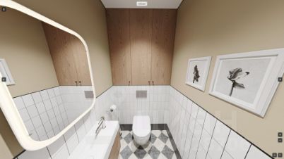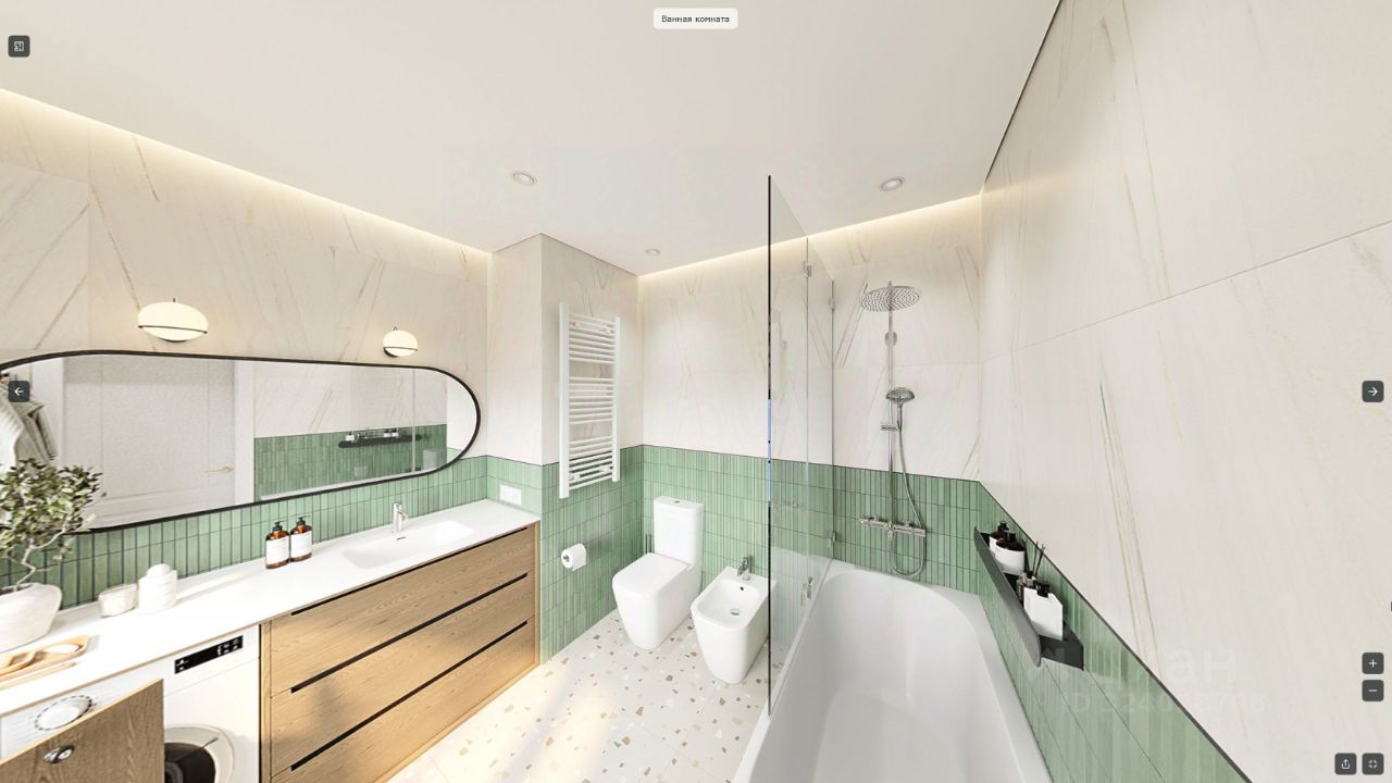Под чистовая отделка: установлены межкомнатные перегородки, стены выравнены и оштукатурены, стяжка пола с шумоизоляцией, гидроизоляция мокрых зон, выведены система водоснабжения, электроснабжения, выведены все розетки. На фото представлены рендеры.