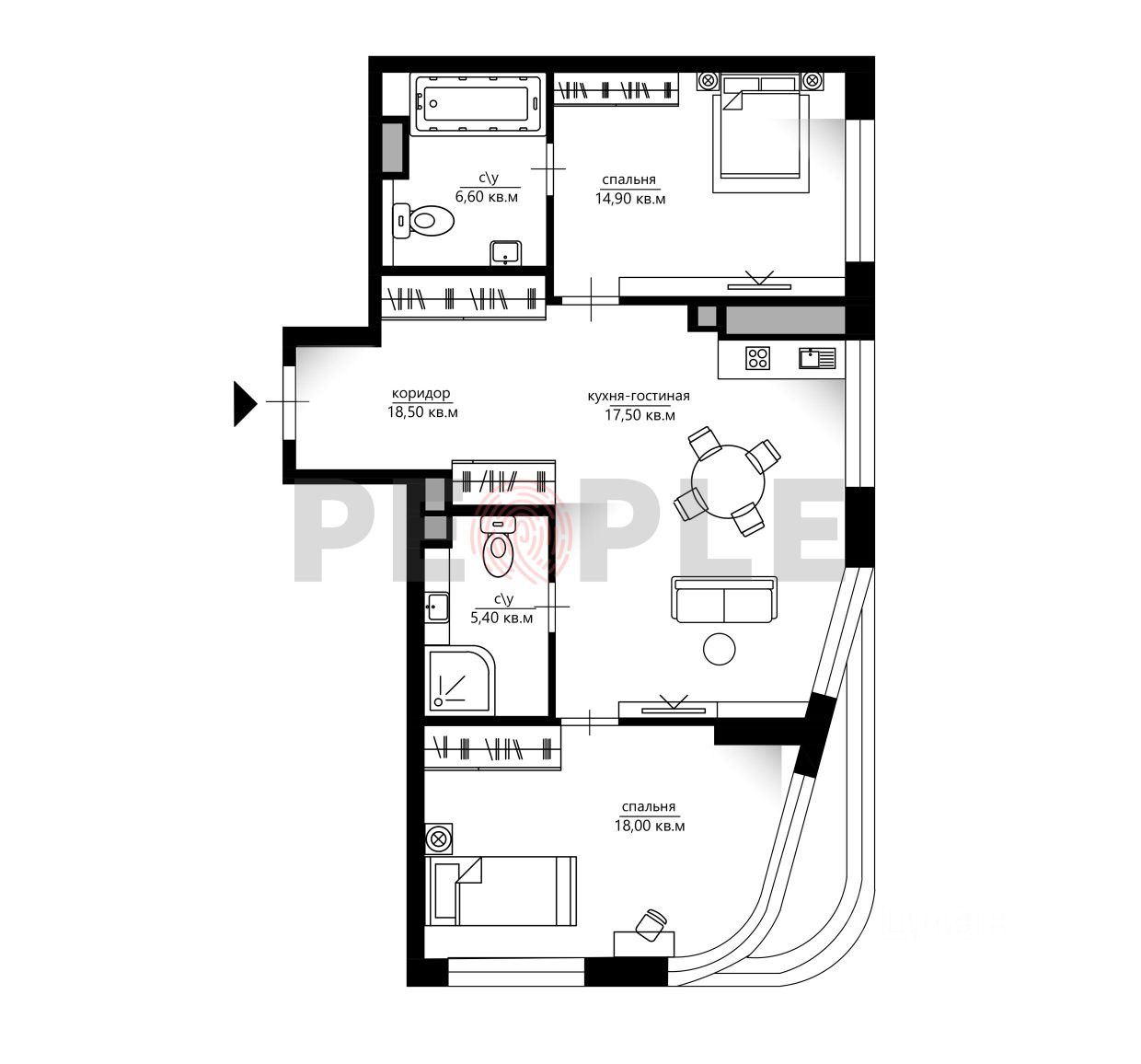 К продаже предлагается просторная трехкомнатная квартира площадью 82.4 кв.м. с двумя спальнями и большой кухней-гостиной.