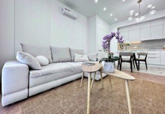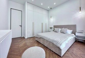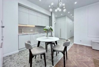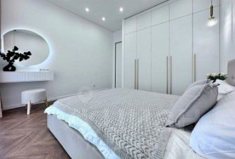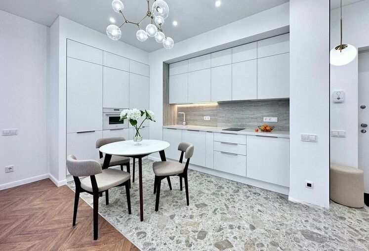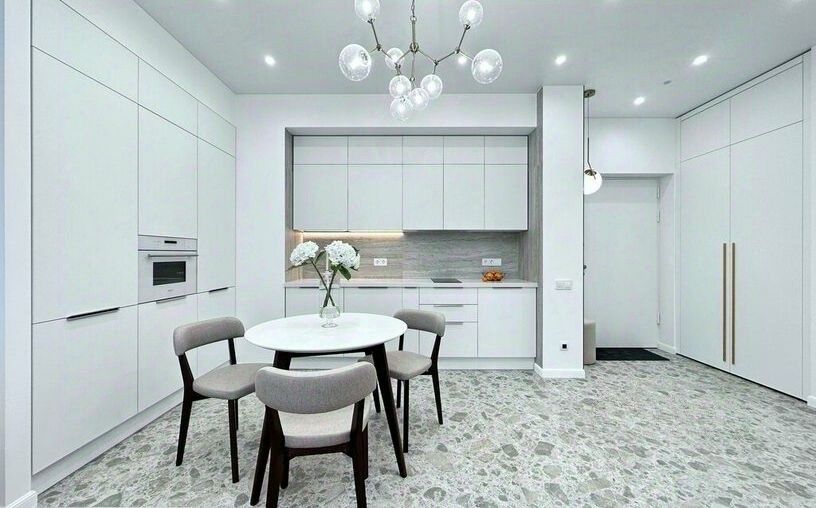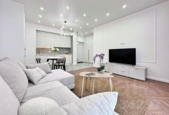 Кухня со столовой зоной оснащена встроенной техникой Weissgauff. В гостиной обустроена зона отдыха с угловым диваном и телевизором с диагональю 55 дюймов, 3 встроенных шкафа.