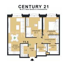 73,6 м² интеллектуальной планировки: светлая кухня-гостиная, две изолированные спальни с французскими балконами, гардеробная и два санузла. Панорамные окна от пола до потолка.