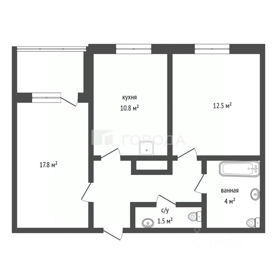 - просторная жилая зона в 30,3 кв. м, две изолированные комнаты предоставляют достаточно места для комфортного проживания: 17,8 кв.м (3,3х4,7м) и 12,5 кв.м (3,3х3,8м)