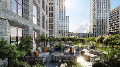 В лобби спроектированы общественная гостиная с кинозалом, лобби-бар, фитнес-зал, библиотека, детская игровая комната и коворкинг с переговорными.