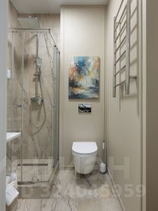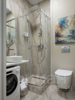 В ванной унитаз с инсталляцией, тропический душ, широкоформатный керамогранит + декоративная штукатурка, датчик от протечек воды.