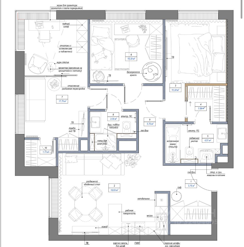 Общая площадь квартиры составляет 80 кв. м, включая просторную кухню-гостиную площадью 19 кв. м, 3 (Три) спальни из которых одна мастер-спальня со своей гардеробной и своим санузлом (ванная), гостевой санузел с душевой кабиной, подсобное помещение: кладовка, гардеробная. Квартира расположена на 26 этаже 30-этажного дома, что обеспечивает потрясающие виды и тишину. Высота потолков составляет 2,9 метра, создавая ощущение простора и комфорта.