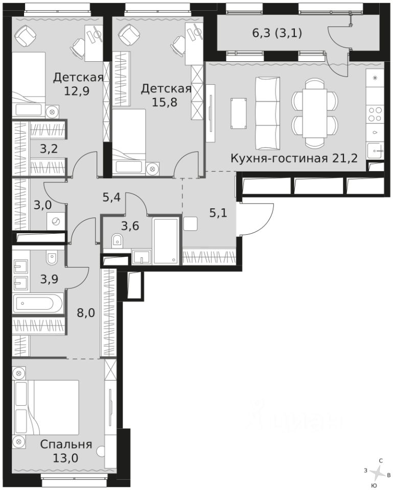 - Мастер-зона с санузлом и гардеробной. Всё для вашего комфорта и удобства, включая личный санузел и гардероб.