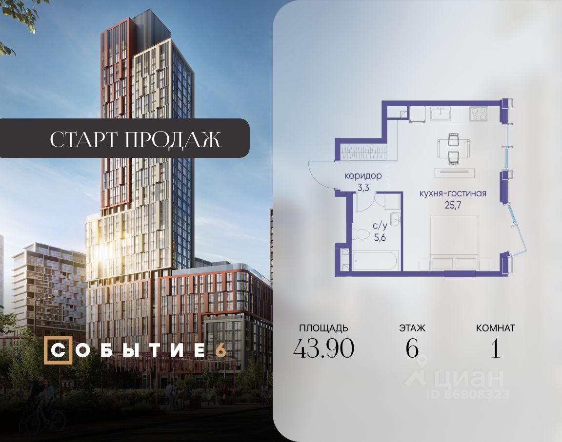 Продаётся 1-комнатная квартира от застройщика: общая площадь 43.90 м², жилая м², кухня м², 6-й этаж, жилой квартал "Событие-6", корпус 2 (секция 4) Срок сдачи: 1 квартал 2029 года.