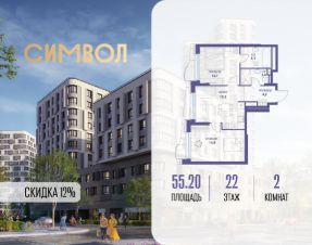 Продается 2-комнатная квартира от застройщика: общая площадь 55.20 м², жилая 27.00 м², кухня 15.50 м², 22-й этаж, жилой квартал "Вдохновение", корпус 34 (секция 1). Срок сдачи: 4 квартал 2027 года.