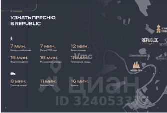 ЖК премиум-класса Republic - новый символ Пресни. 10 жилых башен и 4 восстановленных здания локомотивного депо образуют уникальное пространство. В проекте уникальная инфраструктура: гастрономический центр (типо Депо), торговая галерея с магазинами, большой фитнес со SPA-комплекс с бассейном, детский сад, множество коммерческих помещений в первых этажах. Собственный бульвар и яркие арт-пространства — для жителей предусмотрены все элементы премиального комфорта. 6 га внутренней территории с ландшафтным дизайном, открытая терраса на крыше лобби с кафе на свежем воздухе,