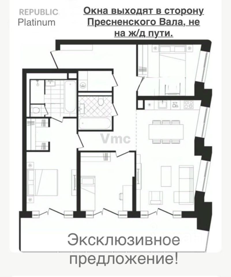 Арт. 89578774. ЭКСКЛЮЗИВНОЕ ПРЕДЛОЖЕНИЕ! ОКНА ВЫХОДЯТ В СТОРОНУ ПРЕСНЕСКОГО ВАЛА, а не на жд пути. ЛУЧШЕЕ ПРЕДЛОЖЕНИЕ. ЖК REPUBLIC, корпус Platinum, 5 этаж, 105 кв. м2, без отделки. Потолки - 3.1 м. Одна из самых удачных квартир. Окна выходят во двор и на Пресненский Вал - квартира тихая. Функциональная планировка: кухня с гостиной, три изолированные комнаты (одна из них мастер - спальня с гардеробной комнатой и с санузлом), три санузла, утепленная лоджия 10.82 кв. м. Также планировка позволяет воплотить в жизнь любые дизайнерские решения. Высота потолков 3.10.