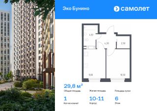 Строим кварталы для жизни с заботой о будущем. Предлагается 1-комнатная квартира комфорт-класса 29,8 кв.м в корпусе 10-11 на 6 этаже, в ЖК "Эко Бунино"