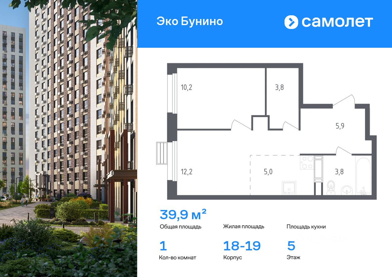 Строим кварталы для жизни с заботой о будущем. Предлагается 1-комнатная квартира комфорт-класса 39,9 кв.м в корпусе 18-19 на 5 этаже, в ЖК "Эко Бунино"