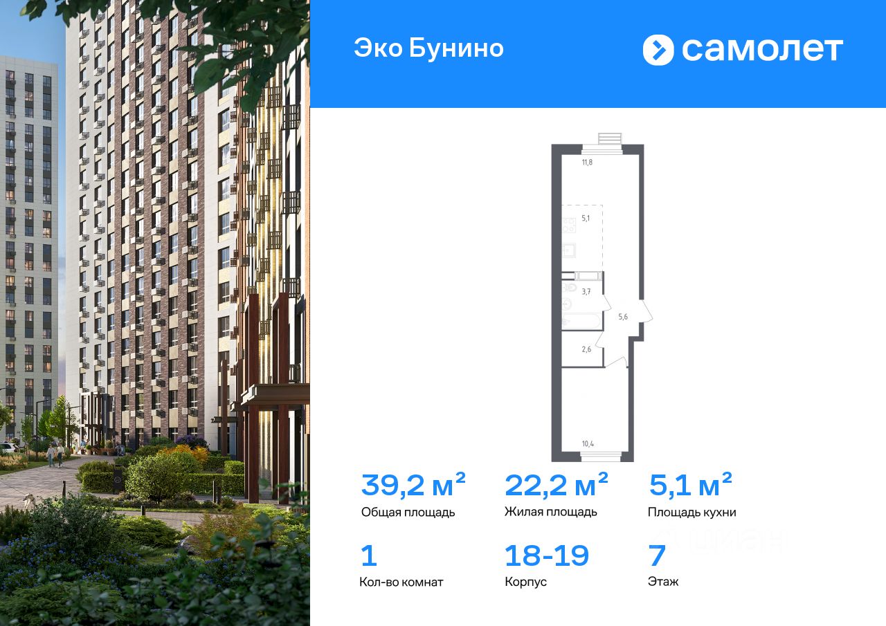 Строим кварталы для жизни с заботой о будущем. Предлагается 1-комнатная квартира комфорт-класса 39,2 кв.м в корпусе 18-19 на 7 этаже, в ЖК "Эко Бунино"