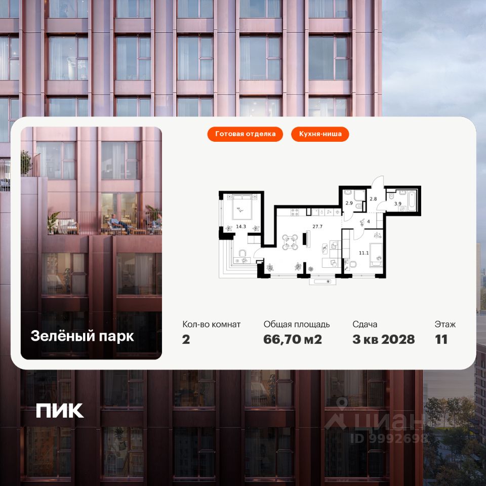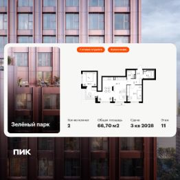 Продаётся 2-комн. квартира площадью 66,7 кв.м на 11 этаже 13 этажного дома (Корпус 5.3, Секция 3) проекта ПИК Зелёный парк. Светлый просторный подъезд на уровне земли, функциональная планировка, большие окна, c отделкой.