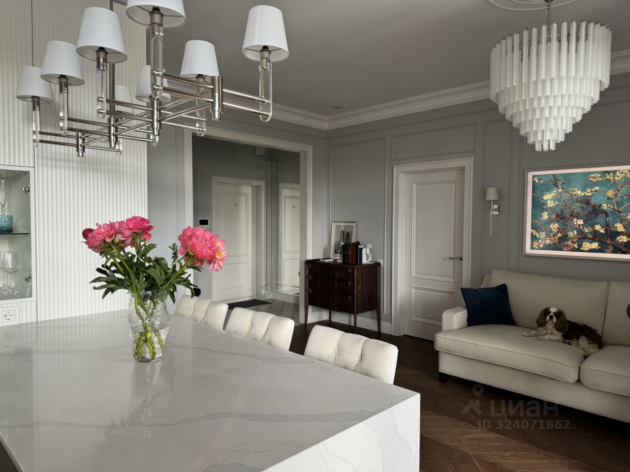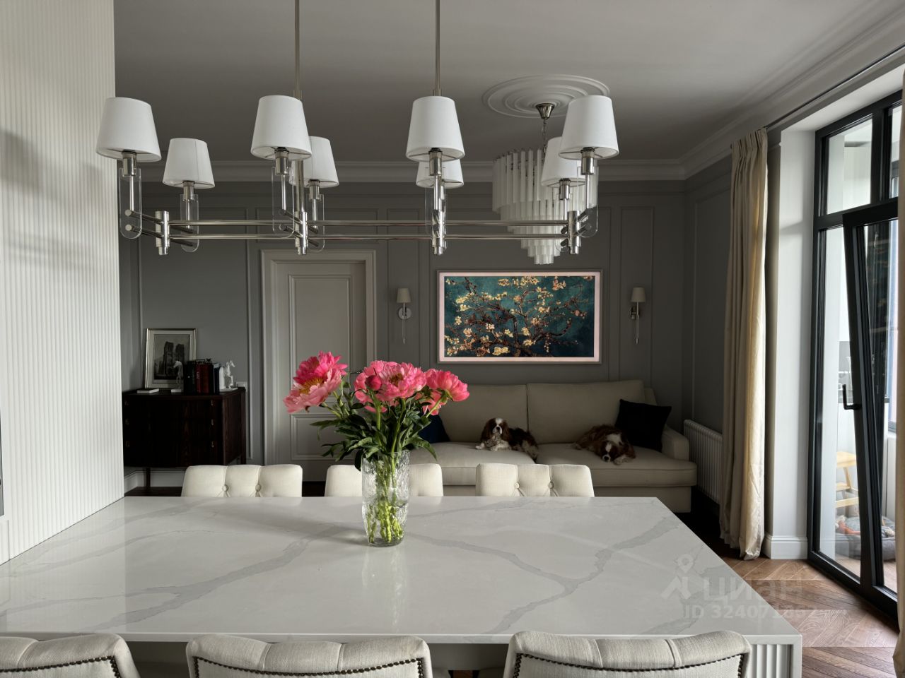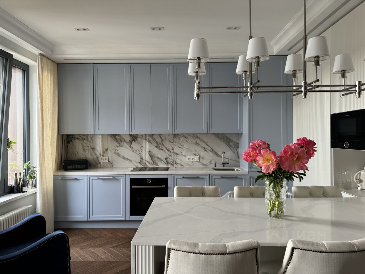 СВЧ печь - все Bosch, винный шкаф на 50 бутылок, холодильник, морозилка - все liebherr, паровой шкаф для одежды от LG. Телевизор Samsung The Frame (65 дюймов) с функцией показа картин незаметно вписан в интерьер. Сплит-система кондиционирования от Mitsubishi. Сантехника Grohe, Cezares, Villeroy&Boch. Свет - Maytoni, Ralph Lauren Home, Dantone. Напольное покрытие - инженерная доска. Теплый пол в душевой комнате, ванной комнате, прихожей и на балконе.