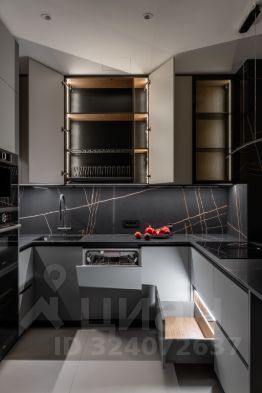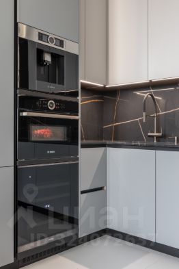 — Просторная кухня-гостиная с полностью укомплектованной кухней с подсветкой. Плита со встроенный в нее вытяжкой, холодильник с морозильной камерой, кофемашина, посудомойка, духовка с функций СВЧ бренда Bosch. Винный шкаф для истинных ценителей. Комфортный стол и стулья для приема гостей и проведения ужинов и барные стулья для быстрых перекусов. Стильный и удобный диван и кресло, для отдыха в гостиной.