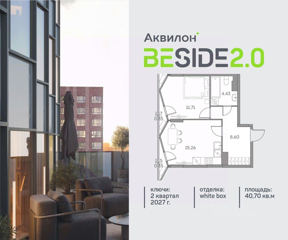 Продается уютная однокомнатная квартира на 4 этаже современного жилого комплекса Beside 2.0. Вид из окон: во двор и на улицу. Срок сдачи: 2 кв. 2027 г.